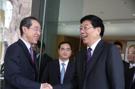 图为徐守盛省长(右一)与唐英年先生(左一)亲切握手合影。