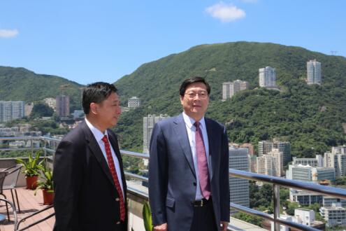 杜家毫省长(右)在刘胜辉董事长陪同下,在三湘大厦37楼天台远眺香港美景。