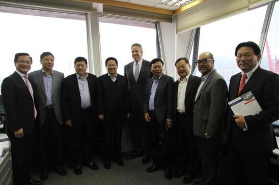 湖南省政协主席陈求发(左四)一行在三湘集团有限公司董事长、总裁刘胜辉(左二)陪同下拜访香港现代货箱码头有限公司并与公司行政总裁柯礼贤(中)、营运总裁余锦华(右二)、发展与工程总裁卢伟民(左一)合影。