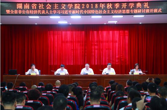 9月6日上午,2018年秋季开学典礼暨全省非公有经济代表人士学习习近平新时代中国特色社会主义经济思想专题研讨班在湖南省社会主义学院开班,省委统战部副部长、省社会主义学院党组书记邓焕生,省委统战部副部长、省工商联党组书记陈潇,省社会主义学院副院长周述杰、彭英、黄自荣出席开班仪式。