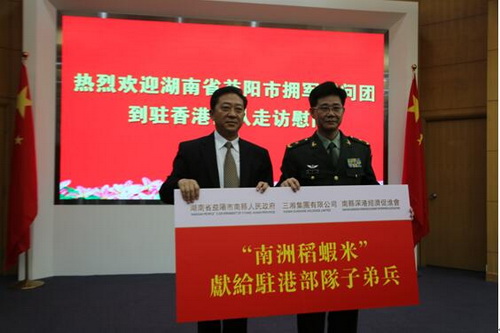 12月7日下午,由南县人民政府、香港湖南联谊总会、三湘集团有限公司共同组织的拥军慰问团走进驻港部队军营,开展拥军慰问活动,南县人民政府代表慰问团一行向驻港部队捐献10吨南县出产的优质南洲稻虾米。参加此次活动的有中央人民政府驻香港联络办公室人事部部长杜业栋,益阳市市委副书记黎石秋,香港湖南联谊总会创会会长、三湘集团有限公司董事长刘胜辉,益阳市委副秘书长周登高,香港湖南联谊总会常务副会长谢竺池,南县人民政府副县长武深树,克明面业董事长陈克明,南县深港经济促进会会长曹力农。